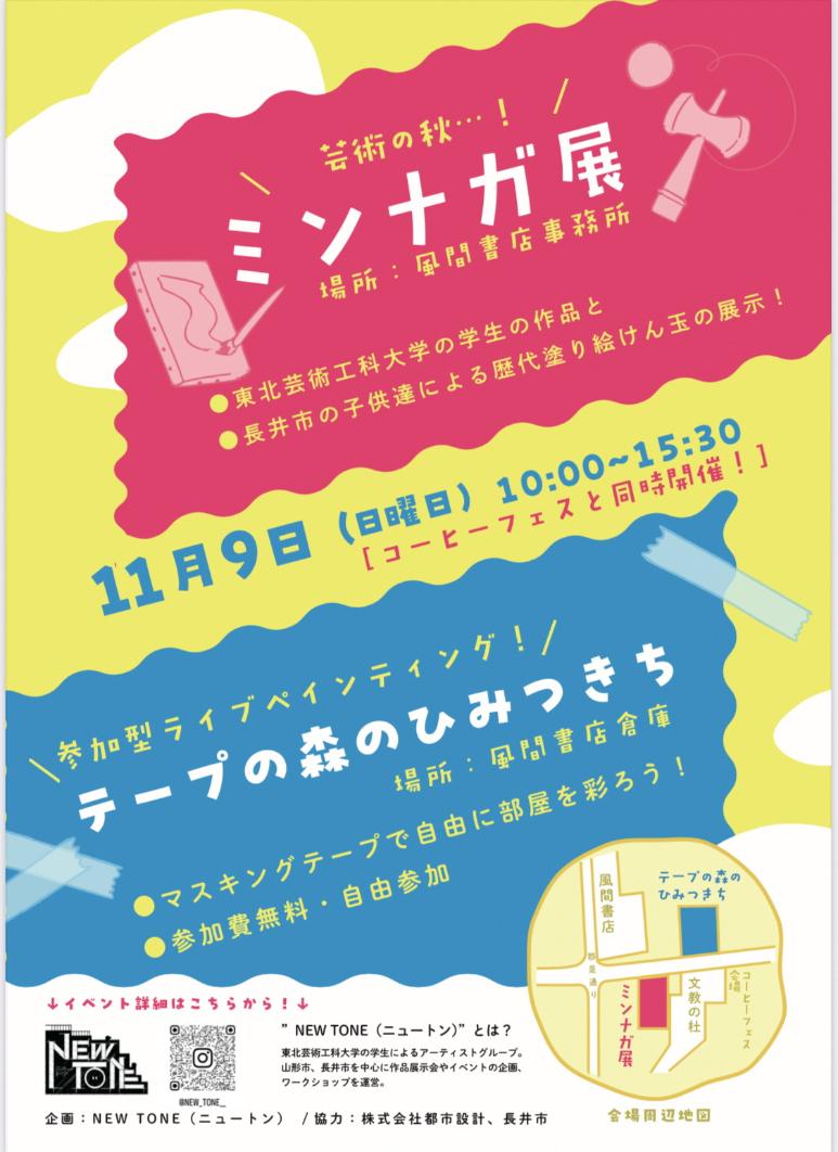 東北芸術工科大学のアーティストグループによる連携企画を実施します。空き店舗を活用した、学生の作品や長井市の子どもたちが書いた歴代のペインティングけん玉の展示と、参加型のライブペインティング企画です。こちらもコーヒーフェスと一緒にぜひ足をお運びください。