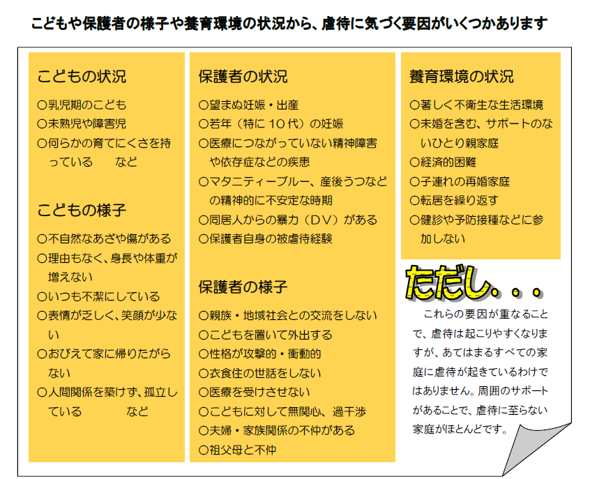現代の子育て環境は、核家族化や地域から孤立している家庭が多く、密室での子育てが、保護者一人にこどもと向き合わせ、相談相手もないまま育児ストレスを抱えている家庭が増加していると言われています。ストレスのはけ口としての暴力のほか、子育てに熱心なあまり、厳しくしつけるつもりで手をあげたり、経済的に苦しく昼夜を問わず働いた結果、放置した状態になったりすることもあります。こういった多くの保護者は自分のしていることが虐待だと気づいていません。
