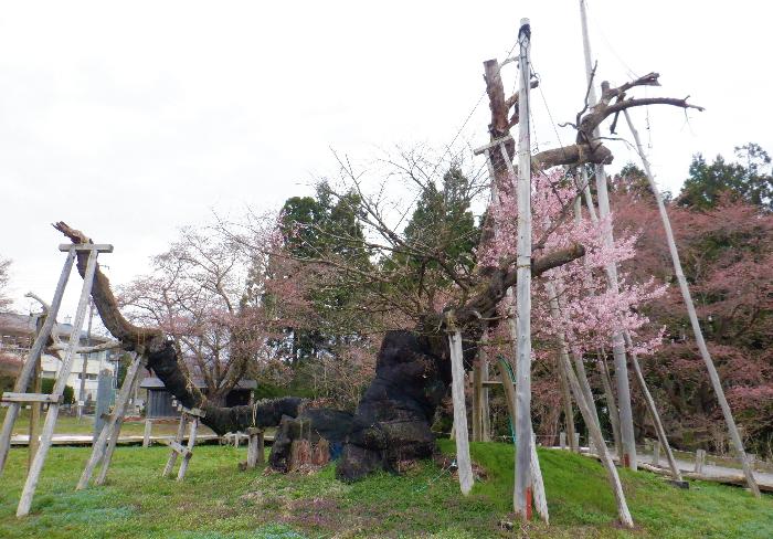 国指定天然記念物の伊佐沢の久保ザクラですが、樹勢の衰えにより枯死が進んでおり、現在は、不定根誘導と呼ばれる治療によって新たに発生した枝が成長し、毎年花を咲かせています。(下記写真中央右側)現在も懸命に花を咲かせるこの枝を50年後、100年後の未来へ繋いでいくため、樹木医の指導のもと、慎重に樹勢回復作業に取り組んでいます。