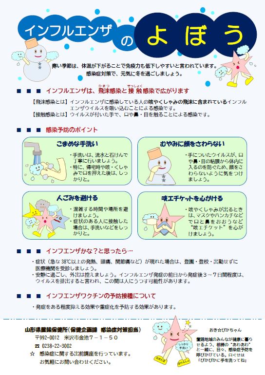 山形県において、インフルエンザの県定点あたりの報告数が流行開始と言われる1.0を上回ったため、例年より3週早く流行期に入りました。インフルエンザは例年11月頃から報告数が増え、12月から3月まで流行が続きます。感染力が非常に強く、流行が始まると短期間で多くの人へ広がるため、一人ひとりが感染予防に努めましょう。