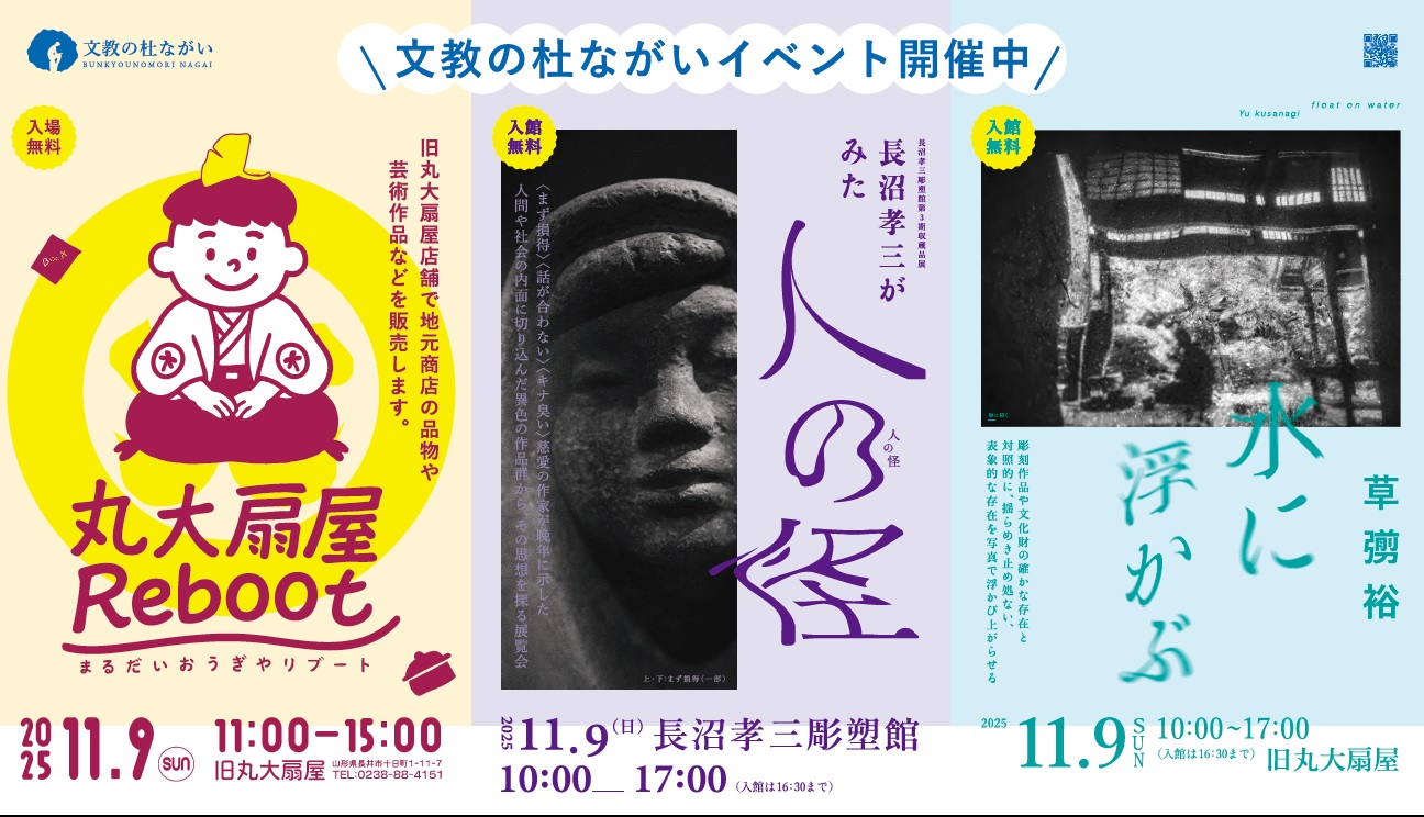 文教の杜ながいでは、10月25日、26日に開催した丸大扇谷Rebootを11月9日に合わせて再度実施します。その他、企画展も開催中。